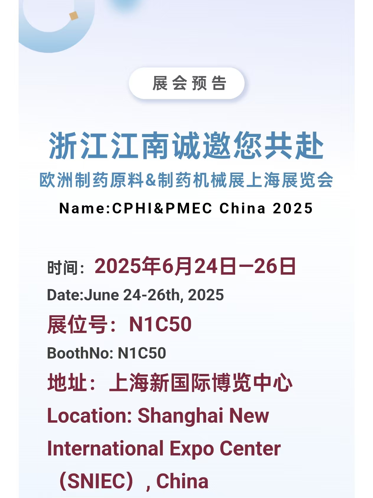 You are warmly welcomed to visit our booth: N1C50(CPHI& P-MEC 2025, Zhejiang Jiangnan Pharmaceutical Machinery Co., Ltd.)